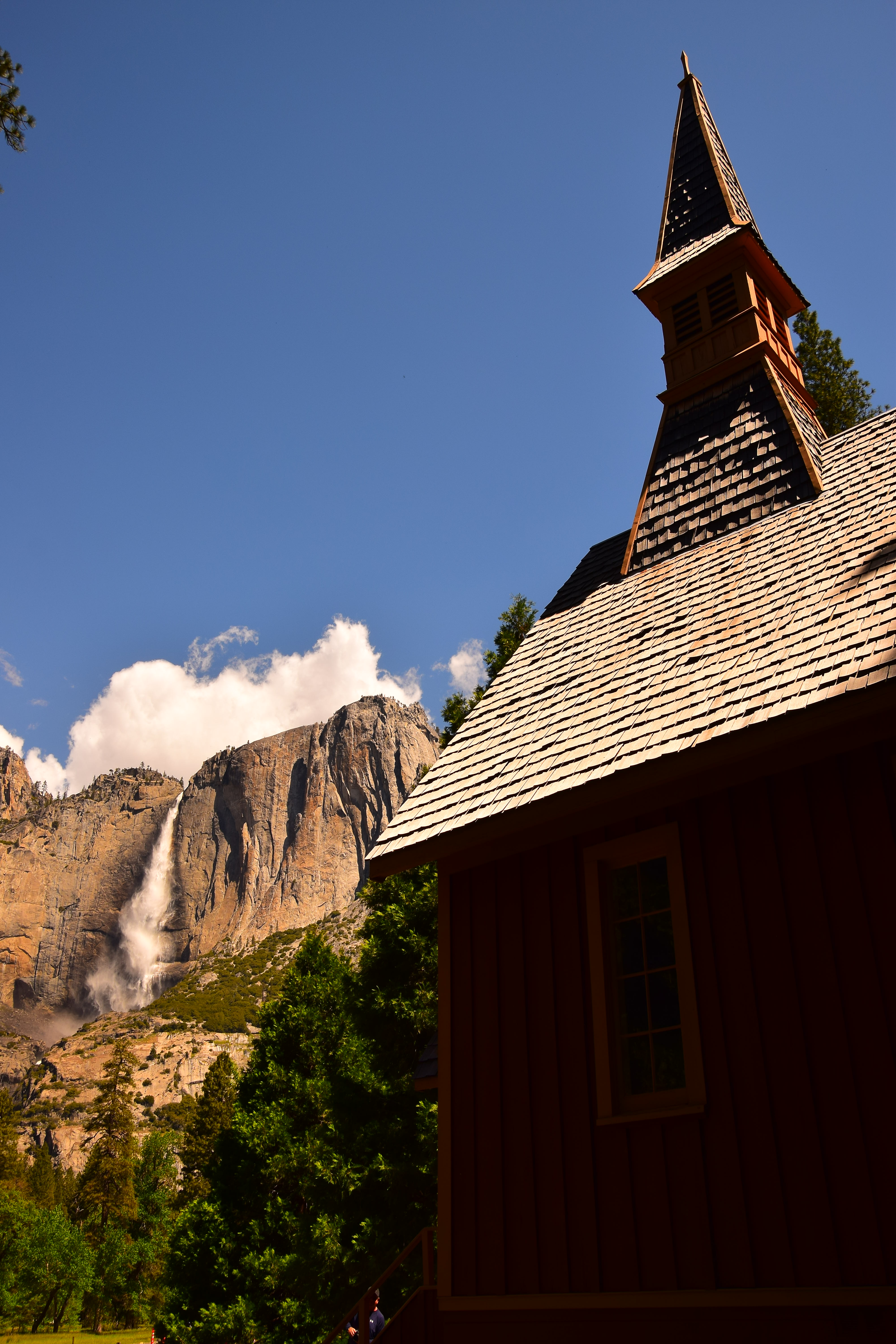 Church and Yosemite Falls, 11:06 A.M. Nikon D3300, Tamron 18-400mm at 21mm, f/9 at 1/320 at Auto ISO 100, Perfectly Clear v3.5. bigger or camera-original © file.