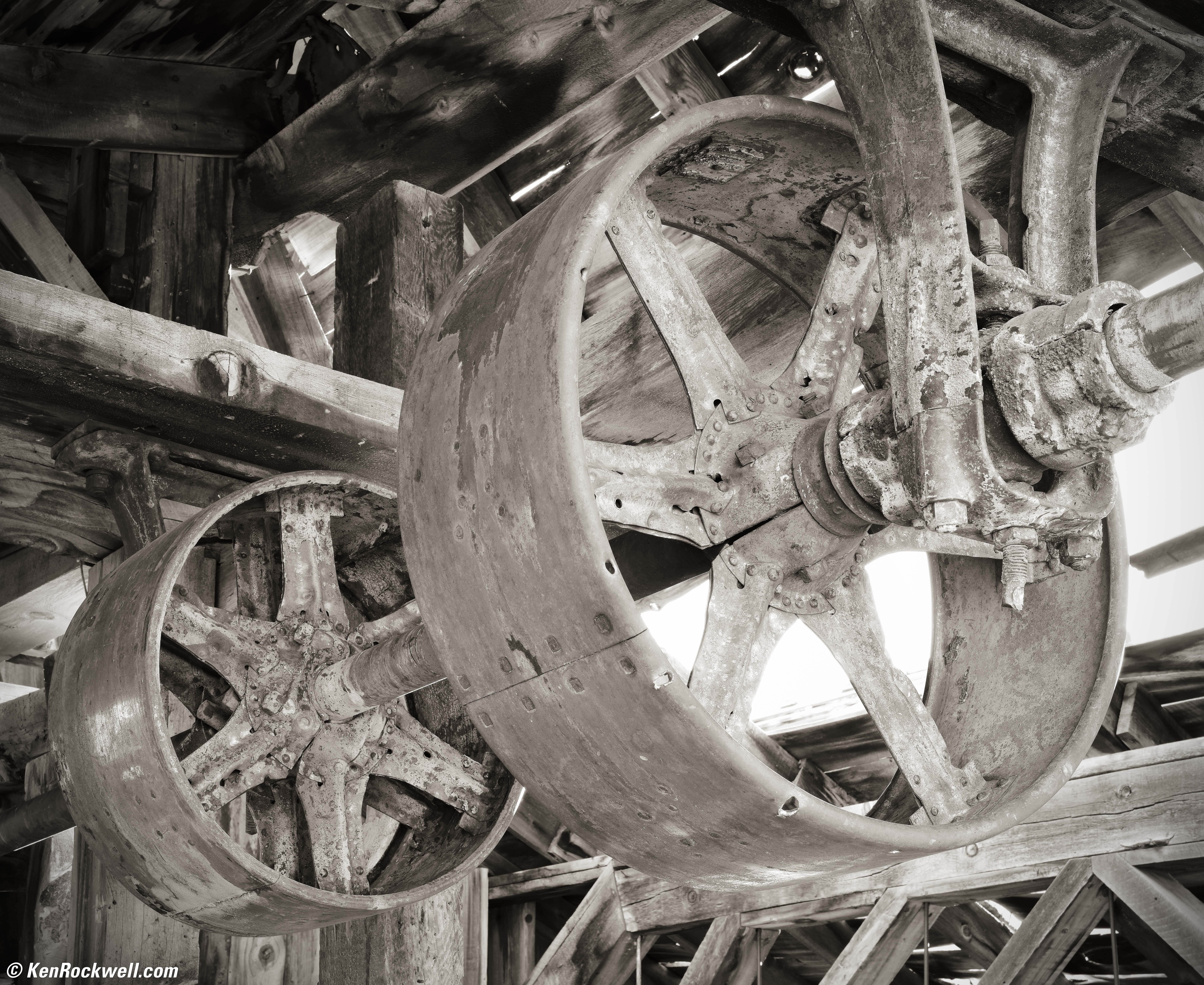 Flaming Maple Tree, Yosemite Valley, Yosemite National Park, California, 10:45 A.M. Apple iPhone 11 Pro Max, 6mm long camera (52mm equivalent) at f/2 at 1/384 at Auto ISO 20 (LV 12.9). bigger. We finished with our Autumn Light in Yosemite group in the morning, and in the afternoon we drove over the pass to Bridgeport to meet our next Fall Color in the Eastern Sierra group, and oh what an incredible group it was. I was in another world! We all said Hi! at 3:30 P.M., broke into little car pools and had our first drive past Walker Lake to an abandoned mine: Belt Pulleys, Abandoned Mine, California's Eastern Sierra, 4:31 P.M., Sunday, 20 October 2019, Cropped from Fujifilm GFX 100, Fujifilm GF 50mm f/3.5, f/16 for 1.6 seconds at ISO 50 (LV 8.4), 100% Dynamic Range, split-toned print. bigger or full resolution cropped (50 MP) image. I shot this in the square-cropped mode, and then cropped this from inside that square. I still have over 50 megapixels here, and it saved me from carrying a longer lens for the week for this one photo. With 102MP, you don't need a lot of lenses. I used the GFX 100 on a Nikon AH-5 tripod spacer on my Manfrotto 410 Geared Head on my original 1995 Gitzo G1227 Mountaineer (world's first) carbon-fibre tripod so I could both stop down to f/16 for depth-of-field and shoot at ISO 50 for the sharpest results.