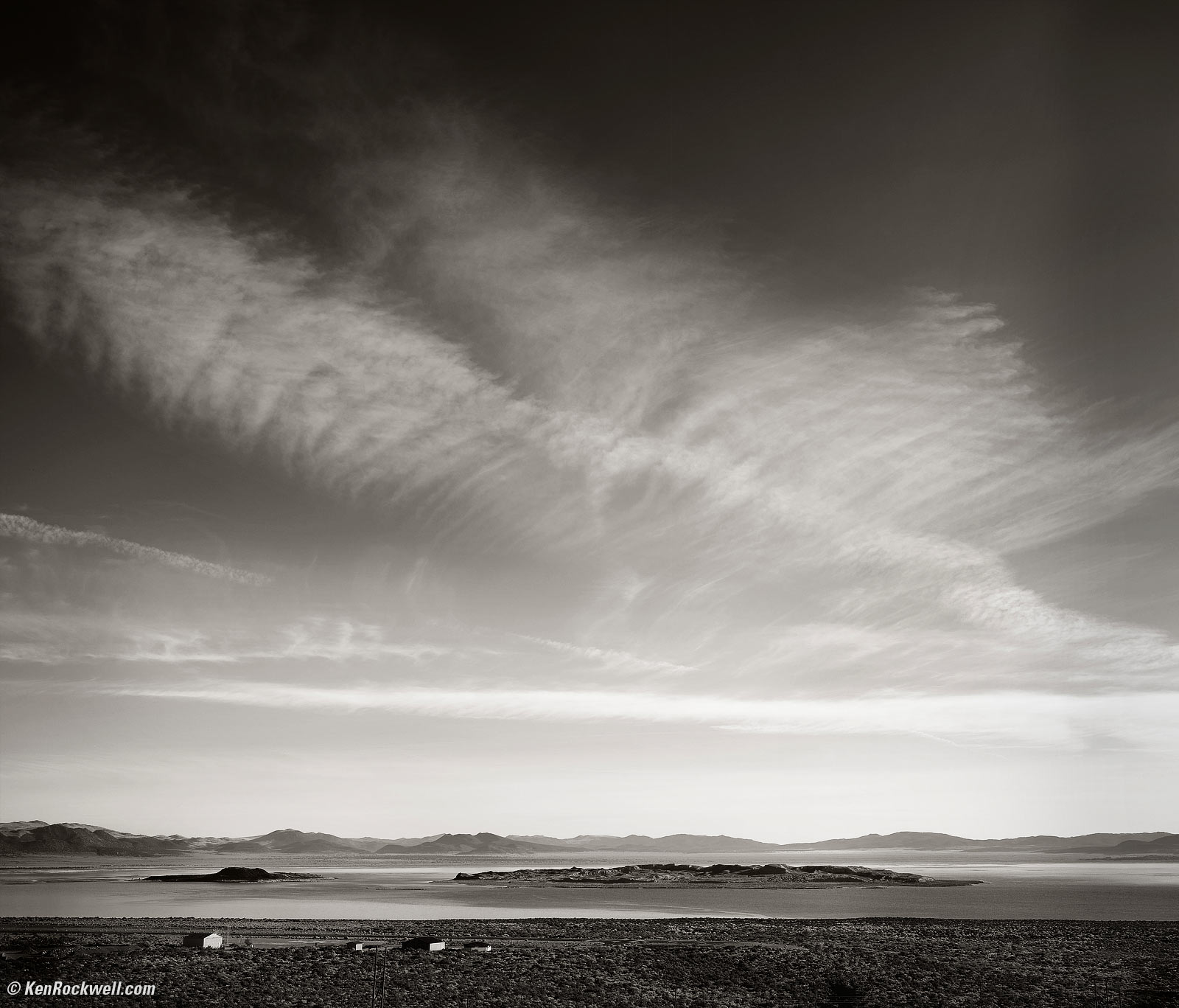 21 October 2019, MondayWe were up well before dawn to photograph sunrise from Conway Summit: Sunrise over Mono Lake as seen from Conway Summit, California's Eastern Sierra, 7:13 A.M. Canon 5DS/R, Canon EF 100-400mm IS L II at 278mm, f/7.1 at 1/500 at Auto ISO 100 with -⅔ stop exposure compensation (LV 14.6). bigger. After dawn, we had breakfast at the Whoa Nellie Deli. Sky over Negit Island, Mono Lake, California, 8:29 A.M. Fujifilm GFX 100, Fujifilm GF 50mm f/3.5 at f/5.6 hand-held at 1/350 at Auto ISO 100 (LV 13.5), Auto Dynamic Range 100%, split-toned print. bigger.