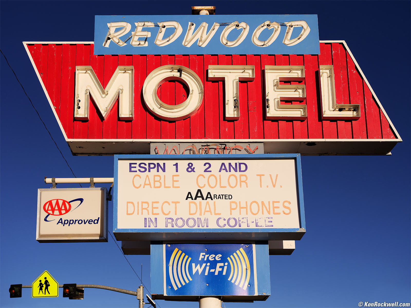 Redwood Motel Sign, Bridgeport, California, 5:08 P.M. Fujifilm GFX 100, Fujifilm GF 50mm f/3.5, f/5.6 hand-held at 1/1,300 second at Auto ISO 200 (LV 14.3), Auto Dynamic Range 200%. bigger.