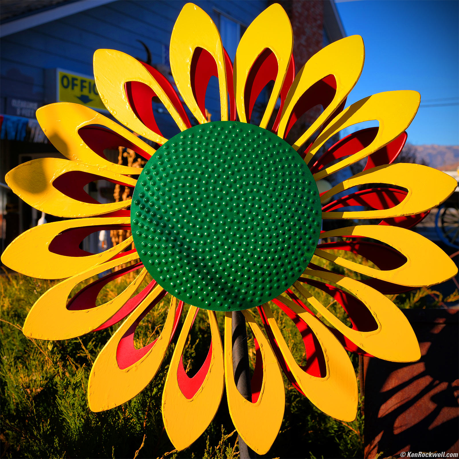 23 October 2019, WednesdaySunflower, Redwood Motel, Bridgeport, California, 12:58 P.M. Fujifilm GFX 100, Fujifilm GF 50mm f/3.5, f/11 hand-held at 1/210 second at Auto ISO 200 with -⅔ stop exposure compensation (LV 13⅔), Auto Dynamic Range 200%. bigger.