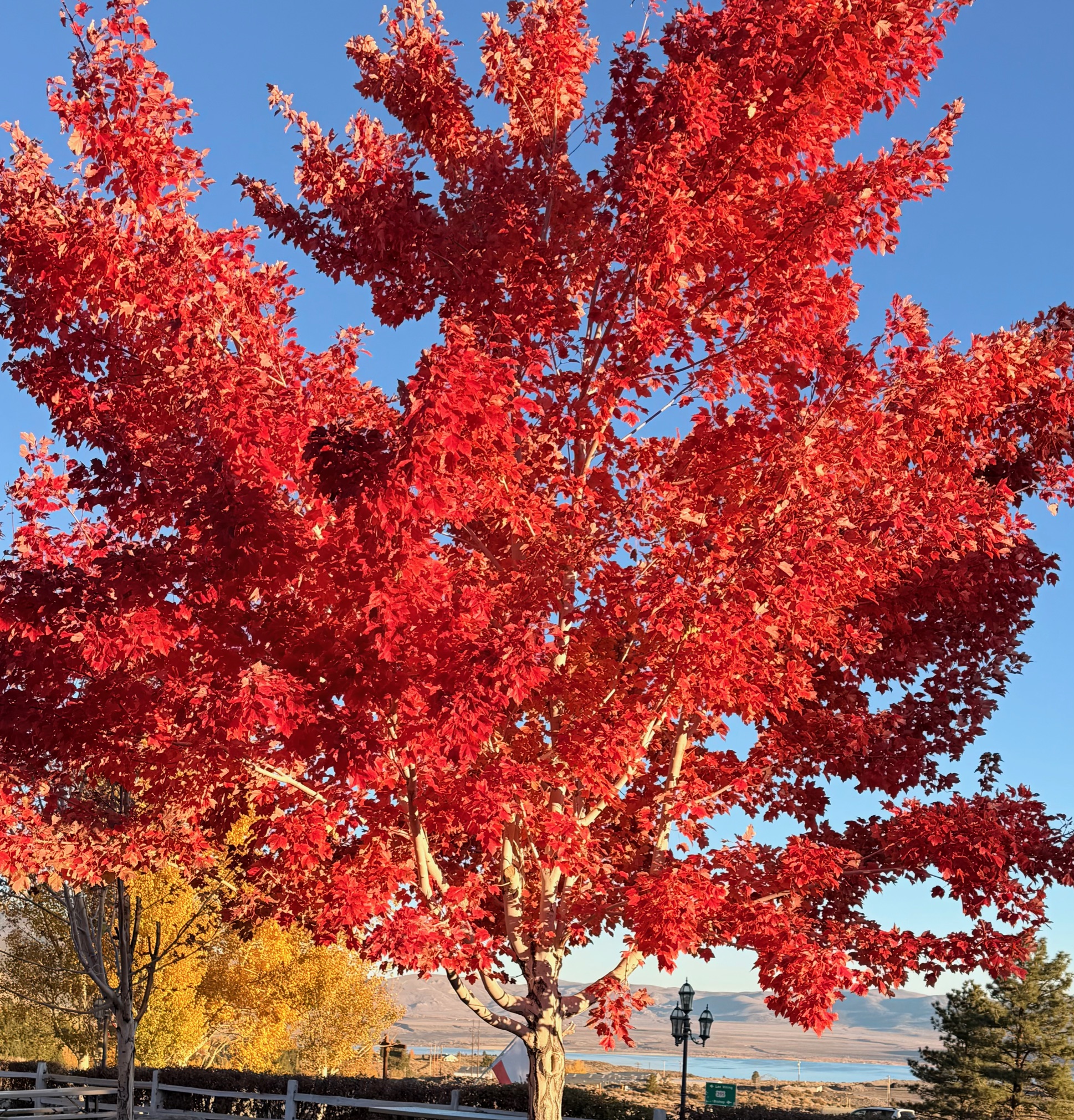 Red Maple, Whoa Nellie Deli, Lee Vining, California, California, 7:47 AM. iPhone 17 Pro Max 1.5× camera (35mm eq.) at f/1.8 at 1/1,192 at Auto ISO 80 (LV 12.2), as shot. bigger or fit-to-screen.