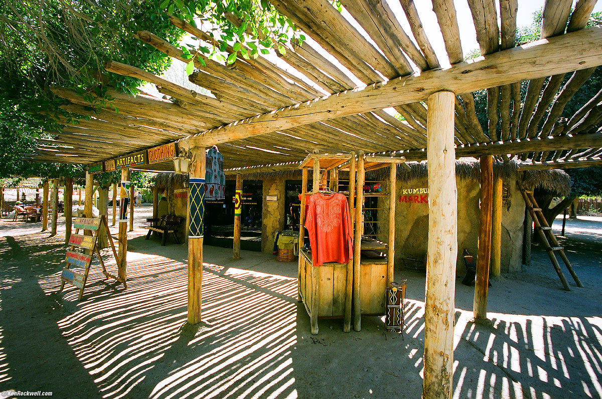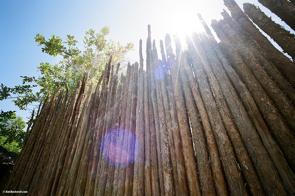 Flare and Ghosts top Living Desert Museum, Someplace in Africa. enlarge. Pointed directly into the sun (at the center of the sunstar). Shot with a Minolta CLE, f/11 at a manually-set speed of 1/30 (to add enough exposure to show the ghosts), Fuji Reala 100, NCPS process and scan.) Ghosts are not a problem unless you ask for them as I did above. I have to go out of my way to cause any ghosts. The only way I can do it is to make a 40 second exposure at f/4.5 at night with a streetlight shining directly into the image, or by pointing it directly into the African sun and overexposing. When I do this, I can see just the faintest blue dots. With the sun in the image in daylight, I see no ghosts. All I see are nice 10-pointed sunstars, unless I overexpose as I did here to show the fence in shadow.