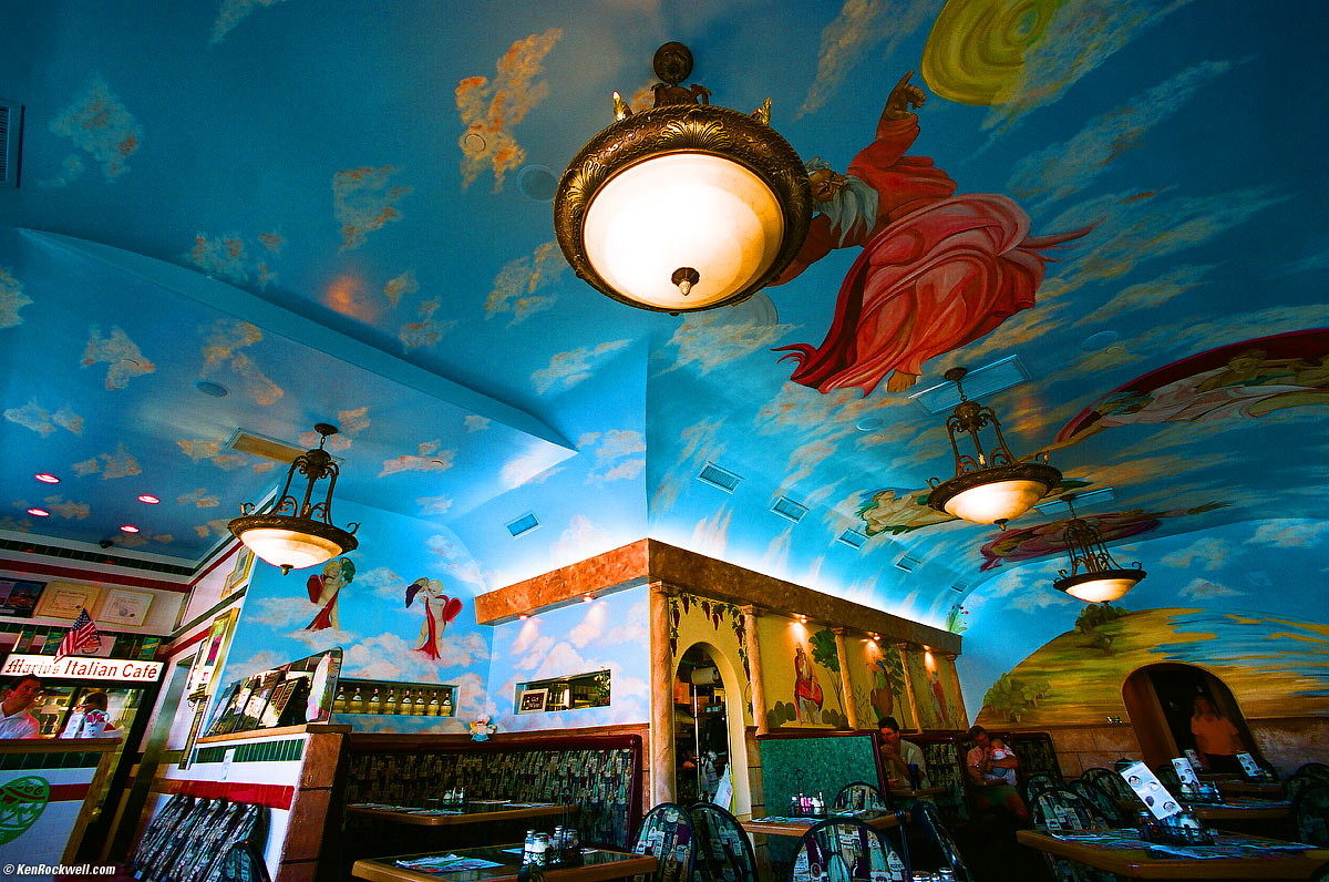 New Version: 2009 top New Voigtländer 15mm f/4.5 for Leica M, twice actual size. enlarge. As of 2009, Voigtländer announced a new version which uses the same extraordinary optics and adds rangefinder coupling and a 52mm filter thread. I'd get it over the earlier lens reviewed here. Mario's Italian Café, Palm Desert, California. enlarge. Voigtländer 15mm, f/4.5, 1/8 second, hand-held, Fuji Reala 100 shot in a Minolta CLE, NCPS processing.