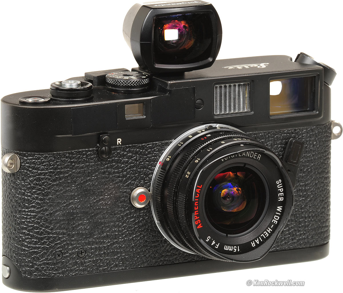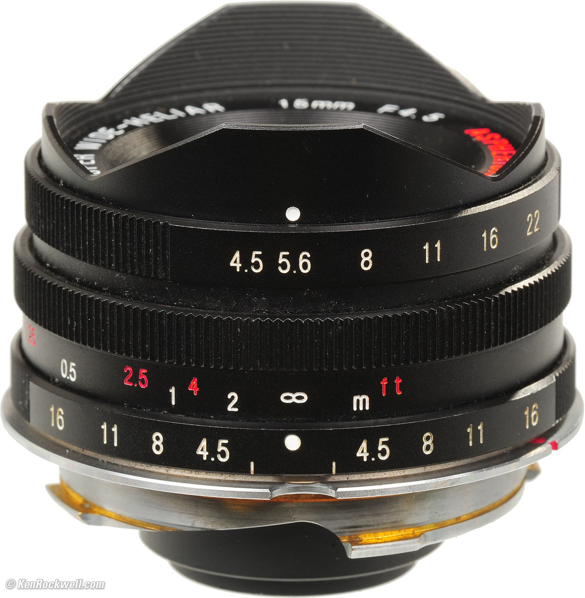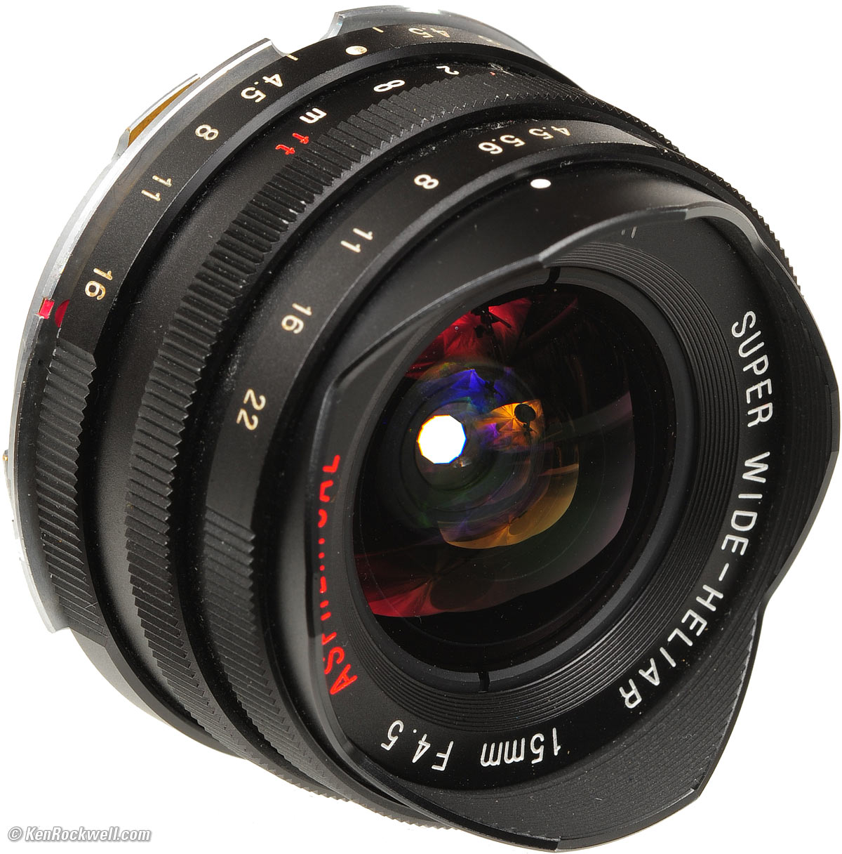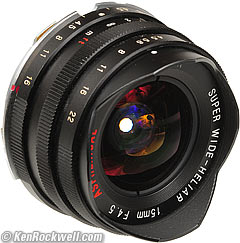 Home New Search Gallery How-To Books Links Workshops About Contact Voigtländer 15mm f/4.5 Intro Specs Performance Usage Recommendations Voigtländer (Cosina) 15mm f/4.5 ASPH with finder on a Leica M4-P, roughly actual size (no filters, 4.090 oz/116.0g). enlarge. It comes in silver, too. I got mine at eBay. Use a screw-mount adapter for M cameras as shown. This all-content, junk-free website's biggest source of support is when you use those or any of these links to approved sources when you get anything, regardless of the country in which you live. Thanks for helping me help you! Ken.