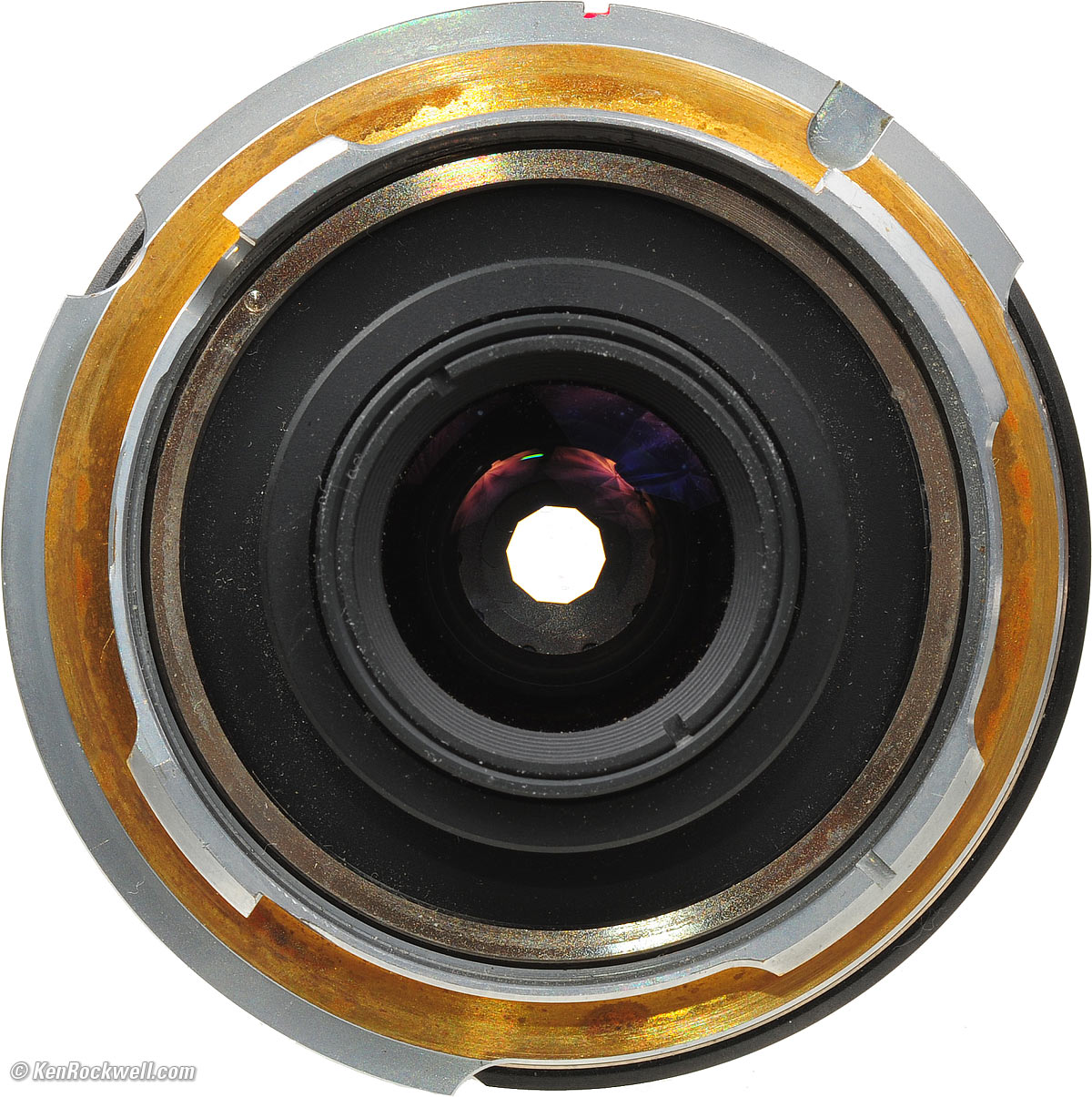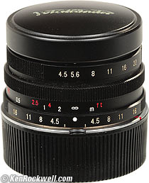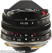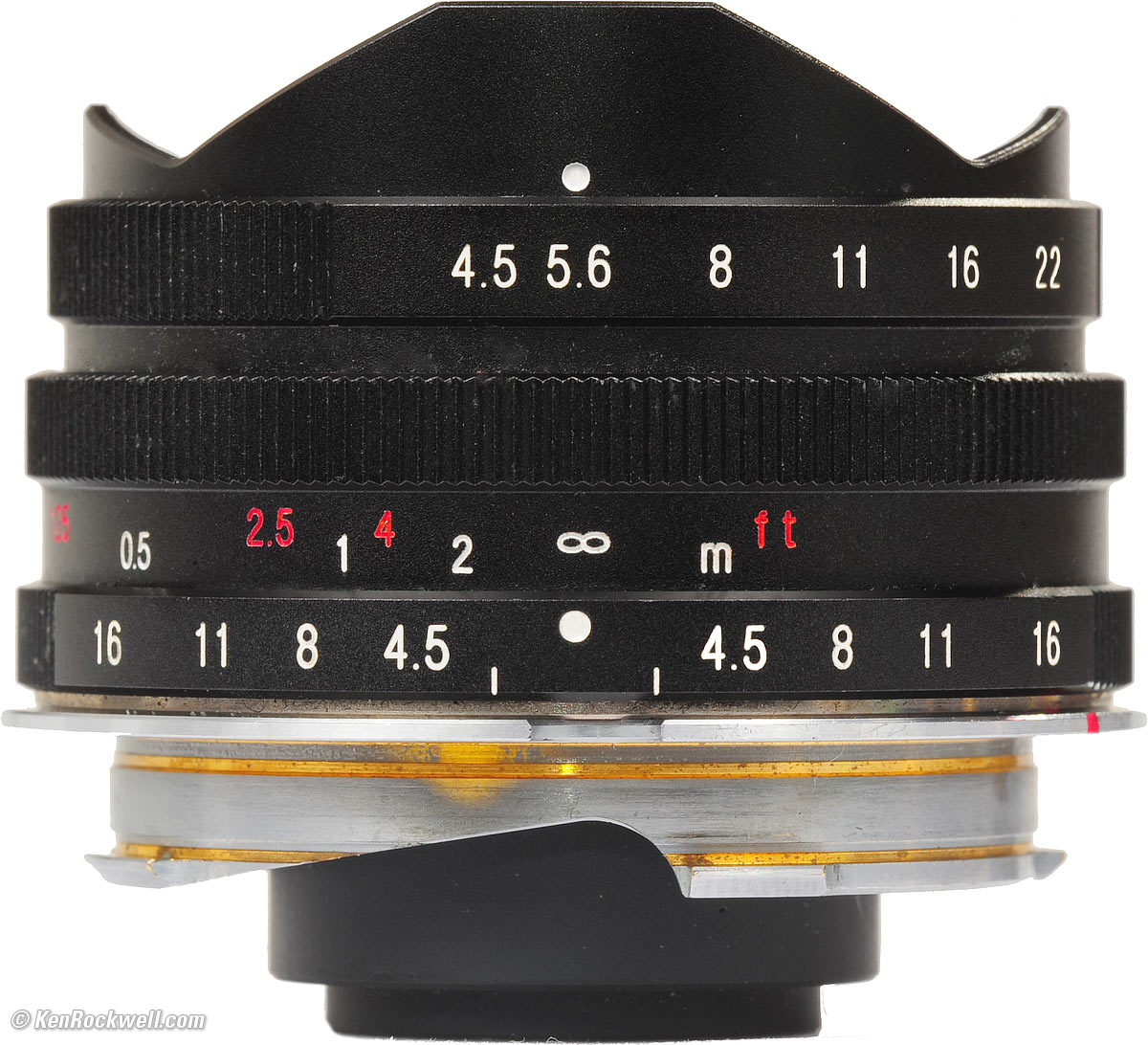 Mechanics and Construction top Voightlander 15mm f/4.5, triple life-size. enlarge more. The Voigtländer ASPH is made just like everything else from Cosina, who makes Zeiss lenses today and made Vivitar lenses yesterday. If this lens looks like a Vivitar T-mount lens from 1973, it's because they made those, too. The 15mm is a good, solid third-party lens. It's all metal, with Cosina's unavoidable triangular ribbing on everything. Front Cap: Stamped painted metal. Barrel: Black anodized aluminum. Focus Ring: Black anodized aluminum. Aperture Ring: Black anodized aluminum. Focus Helicoids: Feel like brass. Other Internals: Metal. Mount: Dull chromed brass. Mounting Index Dot: Red-painted engraved spot on the M-adapter ring. Markings: Engraved and filled with paint. Quality: Made in Japan.