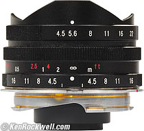 Voigtländer 15mm f/4.5 ASPH, twice life-size. Set the guessed distance, compose through the accessory finder, and shoot. Meter through the camera's finder. The camera's rangefinder doesn't work with this lens. Its depth-of-field is so huge that you can set 6 feet (2 meters) and everything from 3 feet (1m) to infinity will be in focus, even at f/4.5. I get sharp results hand-held even at 1/3 second.