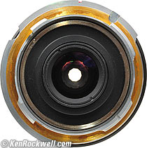 Filters top Here is only only problem. There is no filter thread, and no rear slot for gels. I'm going to have to be creative. 39mm screw-in filters fit inside the front of the lens, but their rings vignette a little and they fall out unless you're pointed up. One of you creative types might want to devise some sort of spring-loading to hold filters inside the front of the lens, and then file-down the rings of 39mm filters so they don't vignette. If you unscrew and drop-in just the glass from 39mm filters, it will bang on the slightly protruding front element. You can hold glass filters over the front of the lens. 67mm seems to be the ideal size. Be careful with filter sizes much larger than 67mm because the lens might see reflections from light sources behind the camera! It's happened to me, holding a glass filter on other wide lenses. Be careful, especially with 67mm filters, that you've got it located in the center of the lens, otherwise you might block one corner. It's best to hold the filter from the left and right sides, since you'll block your finder holding it from the top and bottom. You'll block your film image if you hold it at any angle other than square. You might want to experiment with bumpers on the front of the lens to keep from scratching glass if you do this much. For me, I think taping an 81A gel to the rear may be the way to go, and holding grads over the front when needed.