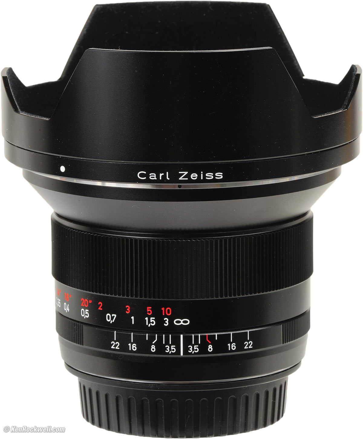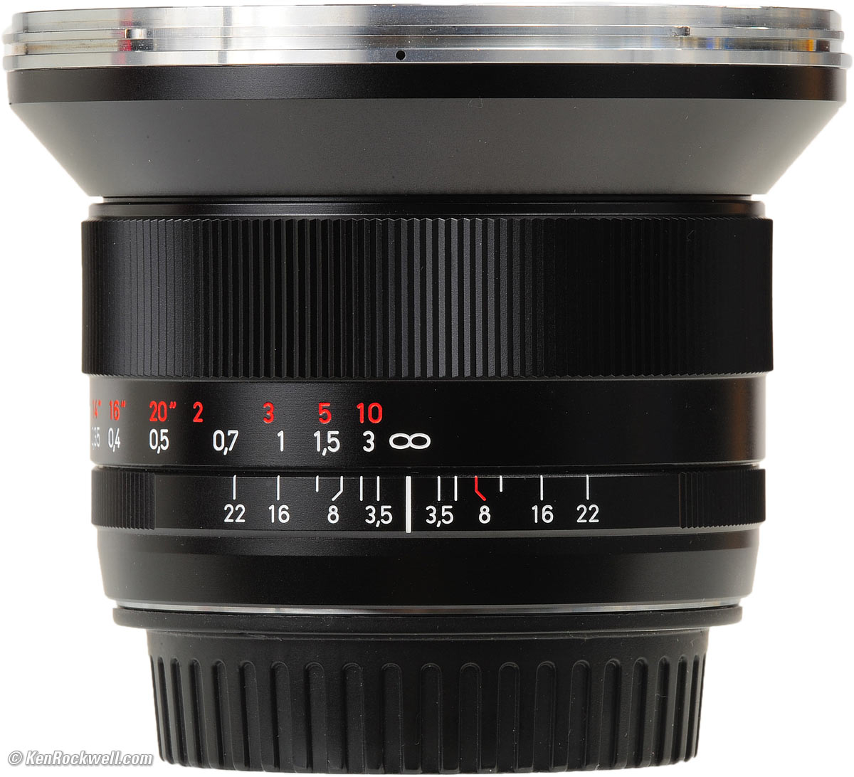 Mechanics and Construction Performance top Rear, Zeiss 18mm f/3.5 ZE. enlarge. This is a tough lens. Don't mess with it. Hood: Anodized aluminum, spring-loaded locking bayonet. Filter Threads and Hood Bayonet Receiver: Chromed metal. Barrel Exterior: Anodized aluminum. Focus Ring: Anodized aluminum. Focus Helicoids: Could be brass. Depth-of-Field Scale: Yes. Internals: Metal. Mount: Dull-chromed brass. Markings: Engraved and filled with paint, as God Himself intended. Identity: Engraved around front of lens. Serial Number: Engraved on front ring. Ass-Gasket (dust seal at mount): No. Noises When Shaken: Almost nothing, in Canon mount. This is the most solid lens I've ever shaken. You're more likely to accidentally throw it while shaking it than you are to hear anything rattling, at least in Canon EF mount. Made in: Japan. Tough. You want Made in Germany? That would cost $4,500 for exactly the same lens. Weaknesses: Potentially slippery metal, easy to drop, and your hands will stick to it in freezing weather.