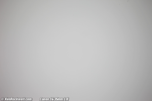 Falloff (darkened corners) performance top All superwides have a lot of falloff. They get dark in the corners, especially at larger apertures. That's what they do, regardless of brand. On Canon, there is no profile available for automatic peripheral illumination correction, as there is for most Canon lenses. Therefore, you'll have to correct this manually if it bothers you. If you do a direct comparison between the Canon 16-35mm II and this Zeiss 18mm on the 5D Mark II, you'll see a big difference, because the 5D II is correcting the 16-35's falloff, but not the Zeiss. I've greatly exaggerated the falloff of the Zeiss 18mm f/3.5 below by shooting a gray field and presenting it on a gray field.