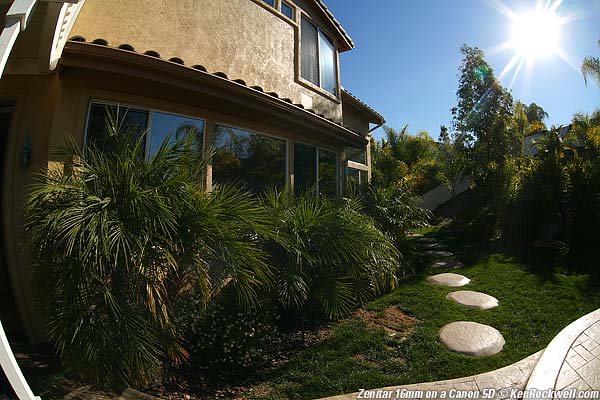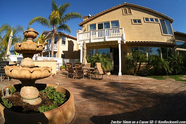 Top Introduction Specs Performance Easy: This lens is a cheap, crappy lens. Like all cheap, crappy equipment, it you're willing to bend over forwards or backwards, you can get great results at f/16, and if you don't mind fuzzy, results are fine at larger apertures. This 16mm fisheye is intended for full-frame cameras. It's a waste of time on DX Nikons or the Canon 1.6x cameras like the Rebels and 40D. It may be of some use on Canon's 1.3x cameras. If you don't mind guessing at manual exposures and can shoot at f/16 all the time, get the Zenitar for a full-frame camera. The Zenitar looks great in these greatly enlarged torture tests, but in practice is a royal pain since you can't just shoot away. No one prints fisheye images as big as I show here, which is the equivalent of 44" (1.1m) wide. Fisheyes are used for comic effect, and you'll lose the punch line if you're busy fumbling with the Zenitar. If you want really sharp images, or want auto diaphragm, auto exposure or basically don't want to take 50 steps to make each shot, then save yourself the trouble and just get the correct Nikon or Canon lens for your camera. Get the 10.5mm Nikon for DX cameras, and the 16mm AF Nikon for Nikon film and FX cameras, and the 15mm Canon for Canon film and Full-Frame cameras. There is no fisheye for Canon 1.3x or 1.6x cameras, sorry. Using the Zenitar 16mm Fisheye on the Canon 5D Metering and Exposure I found metering went bananas since the camera had no communication with the lens. I got different readings as I selected different modes! Using the Av (aperture-prefered) exposure mode was an exercise in futility. I got greatly different exposures at different apertures. I gave up and regained my sanity in manual exposure mode. I use successive approximation, which is looking at the LCD and adjusting the next shot accordingly. Apertures are well calibrated. 1/60 at f/16 works great in full sunlight if you're guessing, or use a hand-held meter just like the 1950s. Aperture The diaphragm is completely manual. It doesn't stay open while you compose and close down as you make each snap. You're back in the 1950s with this lens. If you want to focus on the screen you'll have to open the aperture the hard way after each shot, and stop it back down before the next. Focus There is no electronic focus confirmation in the Canons, and fisheyes have such huge depth of field that there isn't much to see on the ground glass. I prefer to guess the distance and set it on the scale. White Balance For whatever reason, probably the lack of electronic communication, the auto white balance of my 5D went berserk. Use any setting other than AWB. These shots were made in the Daylight setting. PLUG If you find this as helpful as a book you might have had to buy or a workshop you may have had to take, feel free to help me continue helping everyone. It also helps me keep adding to this site when you get your goodies through these links to Ritz, Amazon and Adorama. I use them and recommend them personally . Thanks! Ken
